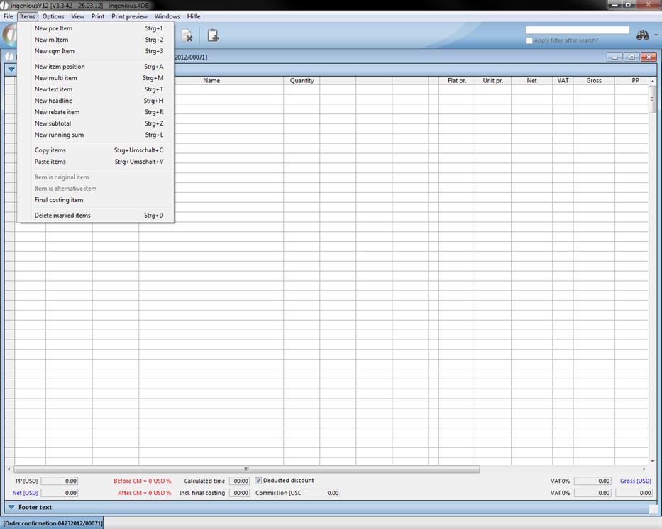 Additionally you are able to rearrange items and change their presentation on printing (PosP = all item features will be displayed; PosPMaße = only the item measurements will be displayed). Just select “Rearrange items” in the menu “Options”. A window will open up, where you can move the items by drag and drop.