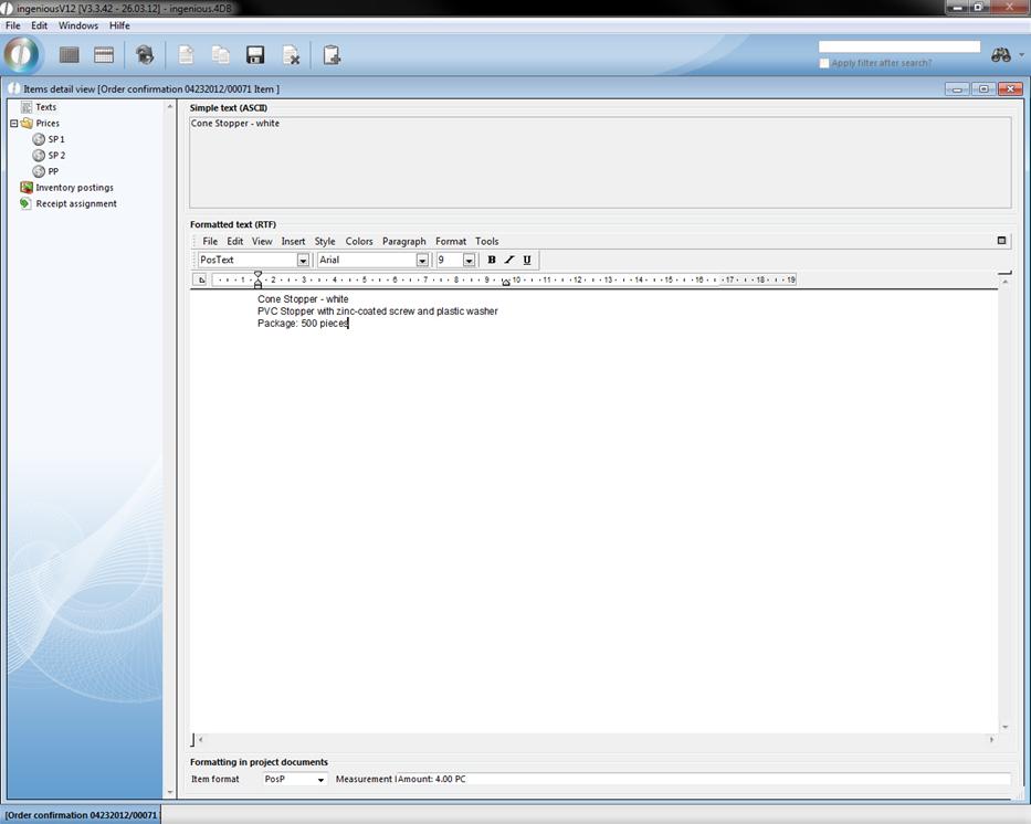 Select the item, “New direct invoice parts item” in the menu, “Items” in the Ingenious.V12 window. The window “Item detail view” opens in which you can describe the item and determine the sales and purchase prices. Here the entered prices are counted per piece.