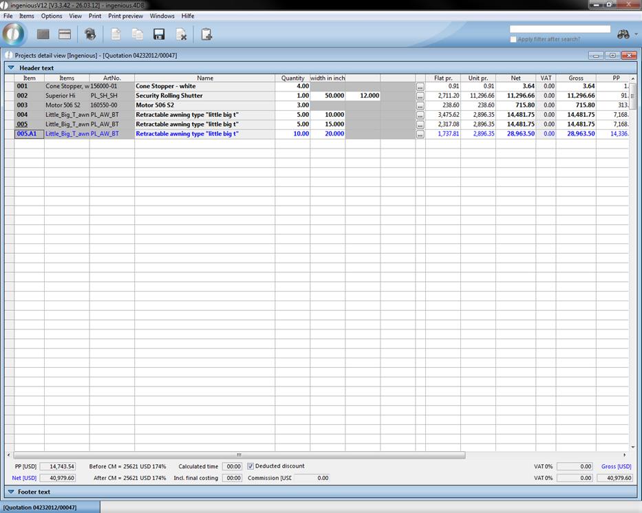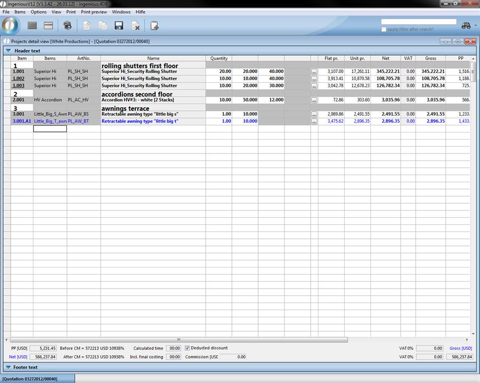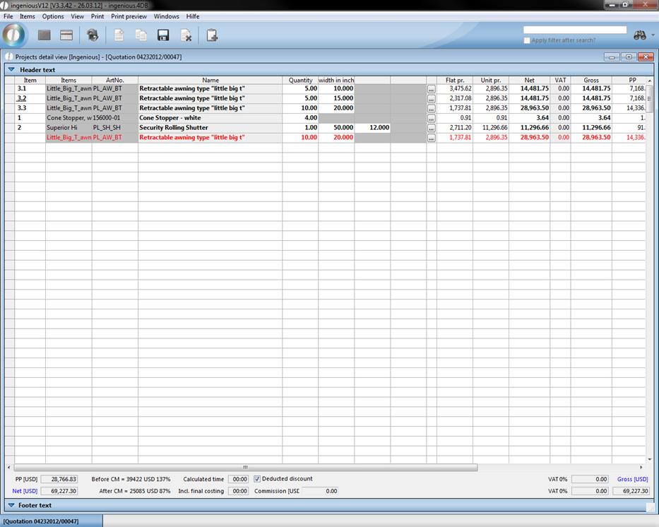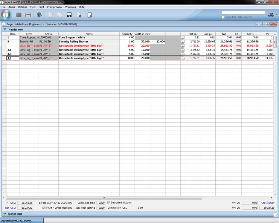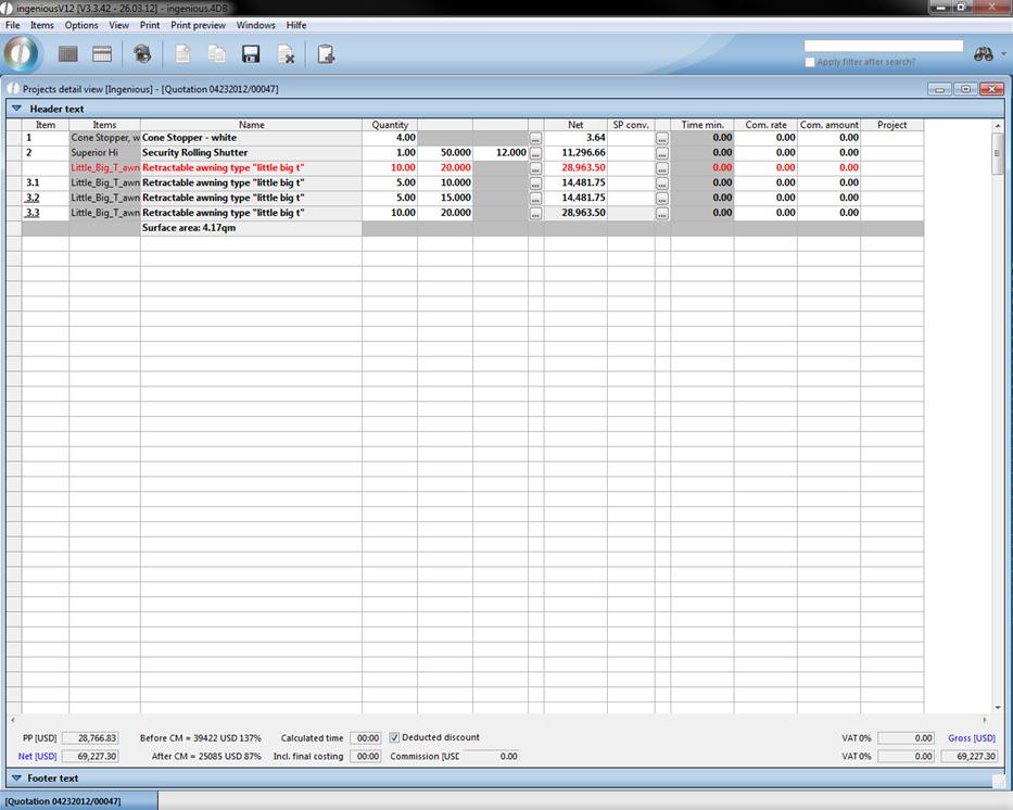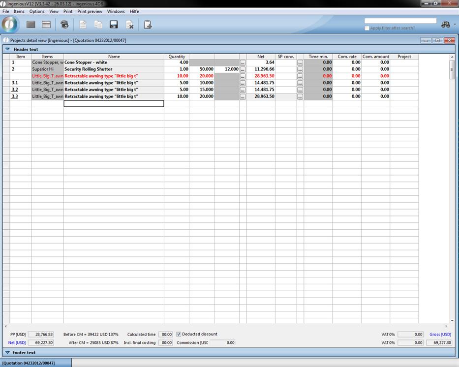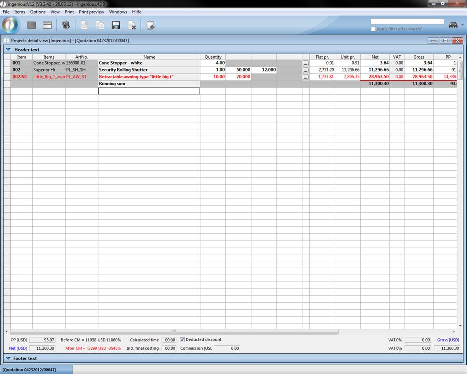 items that should not be included in the sums because they are perhaps only needed or recommended by you, but are not wished by the contact expressly, are shown as optional items, and indicated by the item number “O”. On the printed quotation, this is shown in cursive and with the “Option” script. In the project, this item appears green.