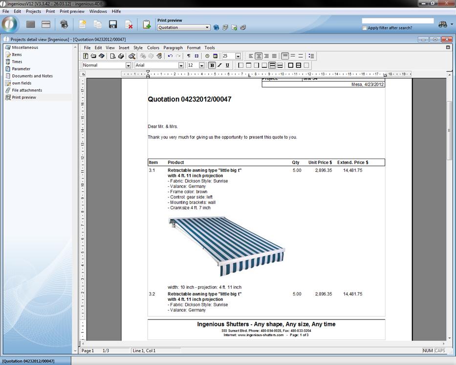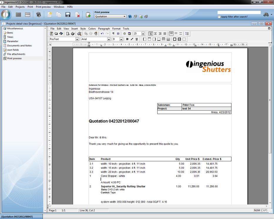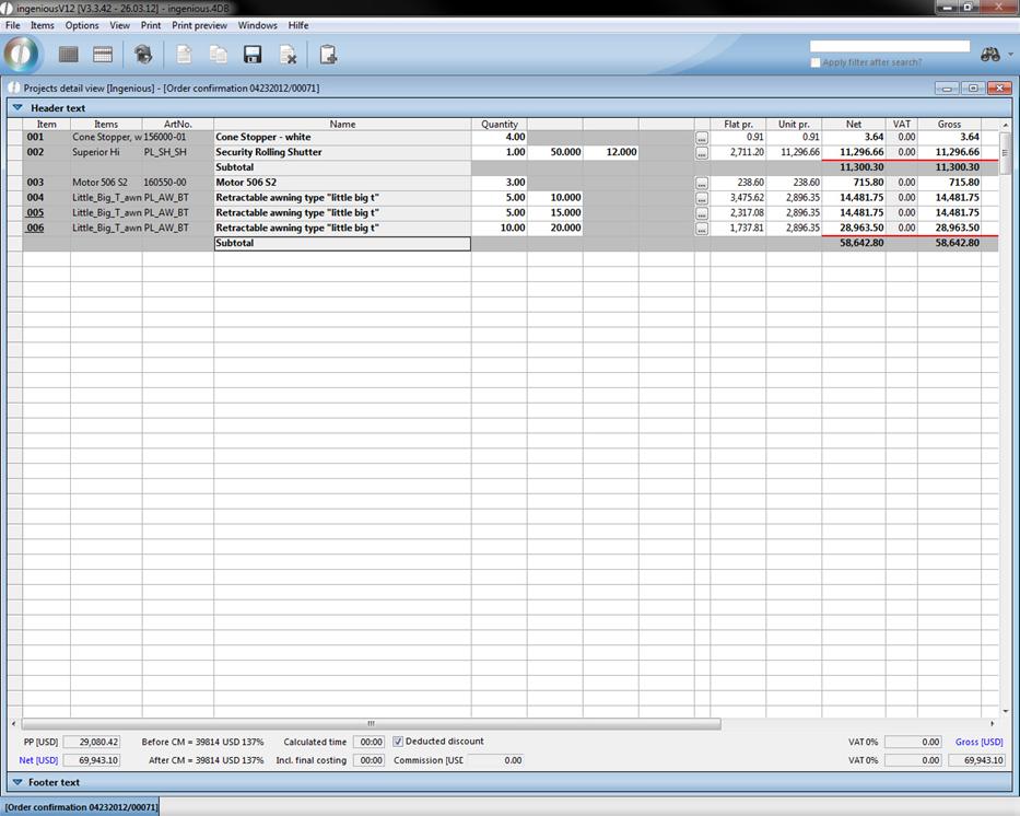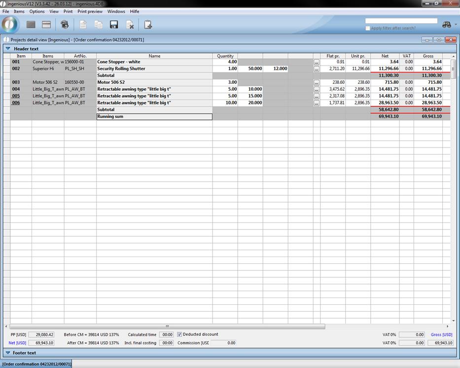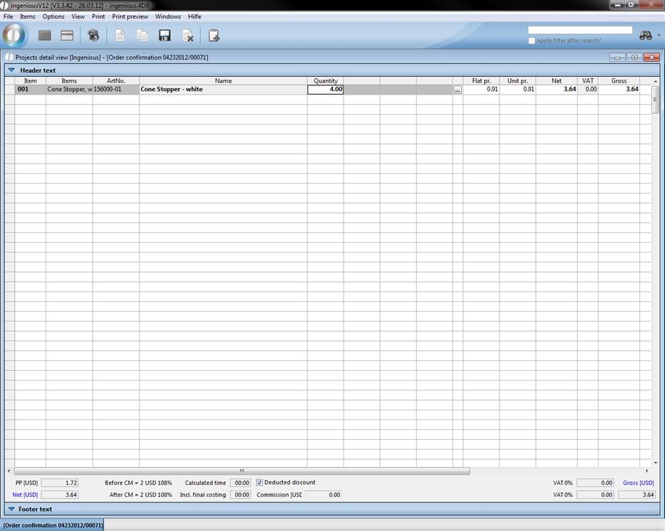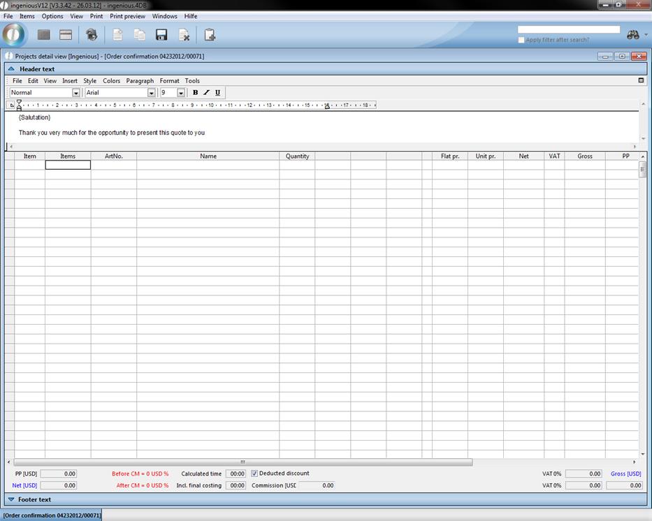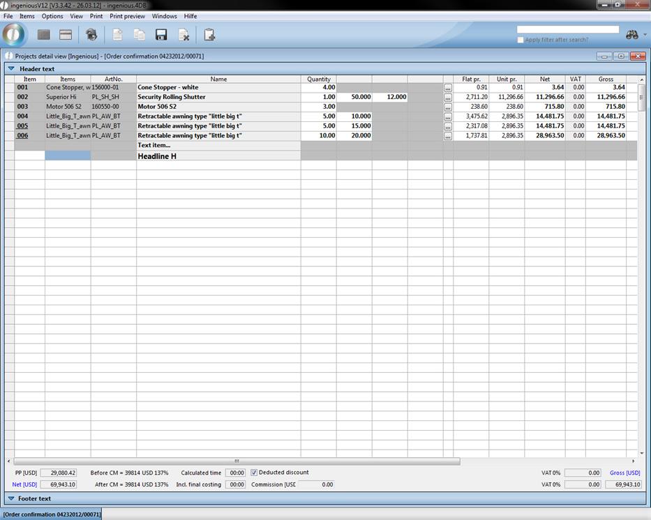 items that should not be included in the sums because they are perhaps only needed or recommended by you, but are not wished by the contact expressly, are shown as optional items, and indicated by the item number “O”. On the printed quotation, this is shown in cursive and with the “Option” script. In the project, this item appears green.