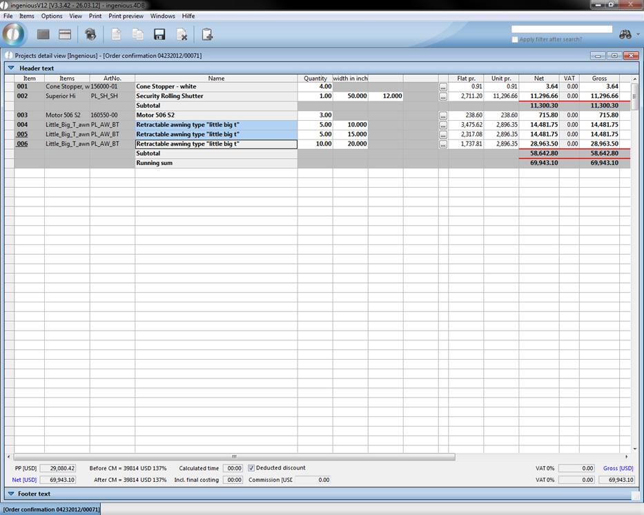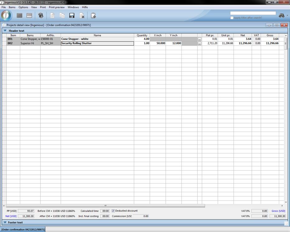 The completion of the amounts and lengths automatically leads to the new calculation of the sums. Here you can also enter the items directly into the template. For a meter price, you enter the length in the “X cm” column and for a square meter item, you insert the width in the “Y cm” column. Ingenious.V12 will automatically choose the correct direct invoicing item.