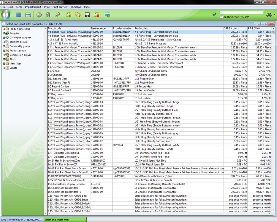 Frequently used typical company items are collected in the product catalogue. In order to insert such an item in your project document, enter the item number or the matchcode. The item is transferred from the catalog. If you would like to search for items with the joker character or product groups for example, choose “New item item” in the “Items” menu or alternatively enter * directly into the respective blank line. The item catalog is opened and with a double-click, you can select an item with the search function or by entering a matchcode.