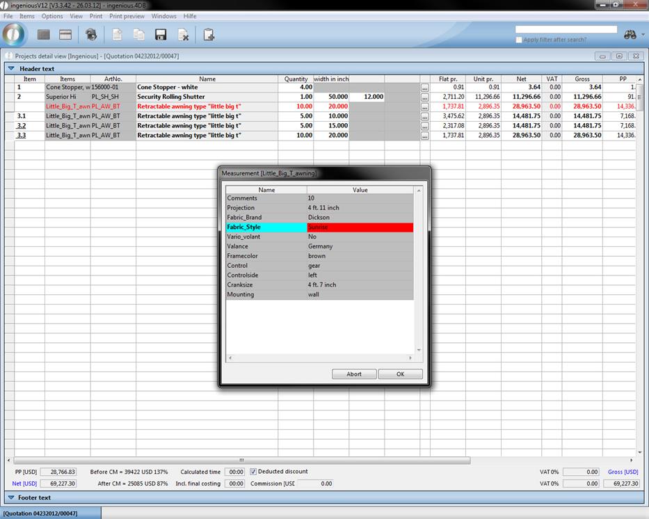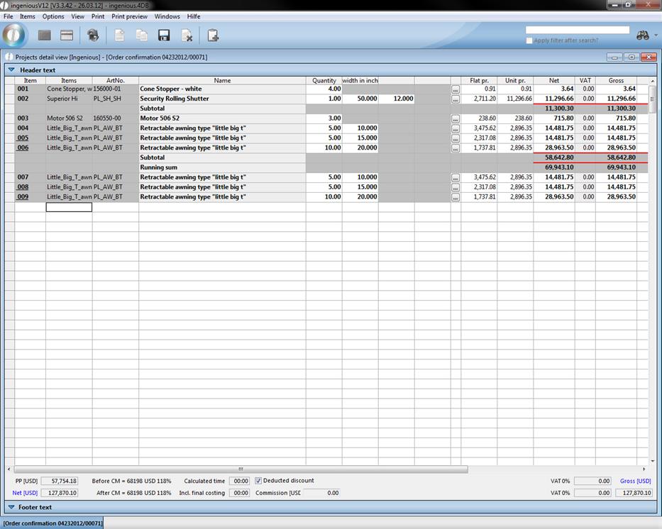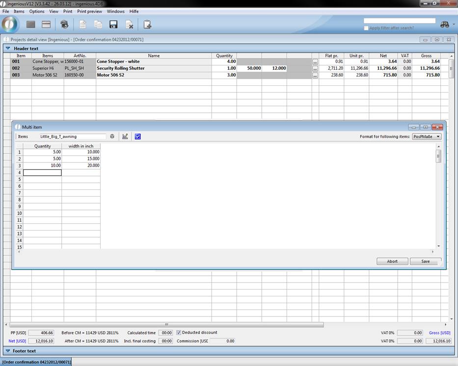 Ingenious.V12 inserts the item in the project document exactly as often as different measurements were given. In the printed document, the item appears only once with its description and the following items contain only the dimensions.