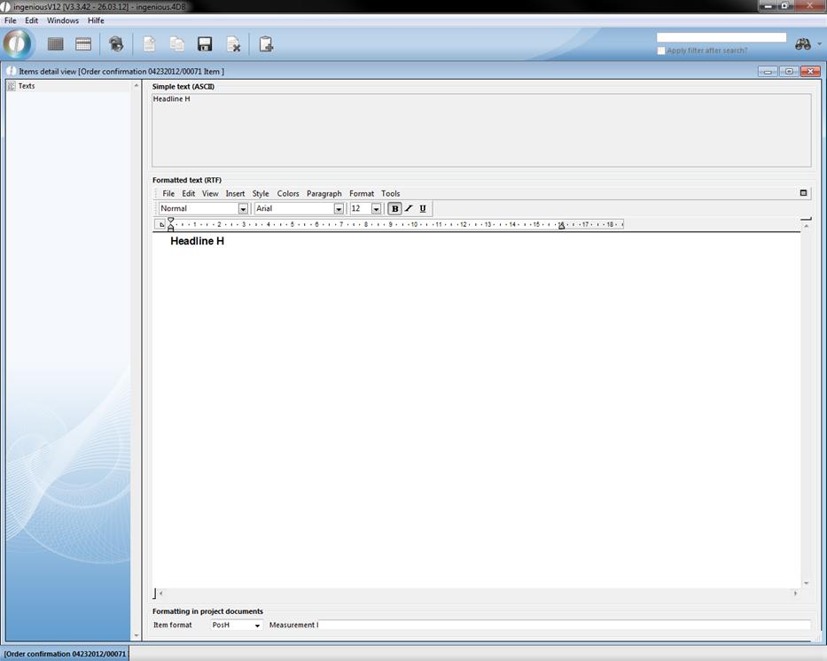 In order to create your document more clearly, you can work with headings (Menu: Positions - New heading). You can insert and edit these like a text item.