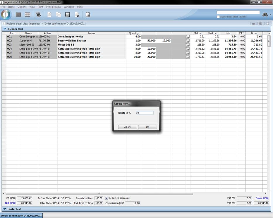 You can grant a rebate on single or several items, or on the whole order value. Pay attention to the fact that you insert the rebate item in each case directly under the line from which the price value should be drawn. If for example a text item stands between both items, no rebate can be calculated because in this line no price is included. With rebates of an item, you enter the rebate item directly underneath. Should several or all items be discounted, the sum must be determined beforehand.