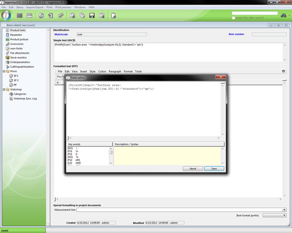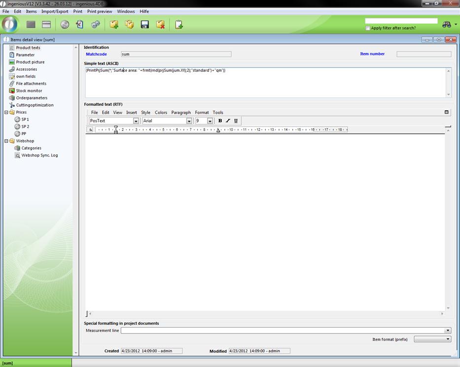 The surface area of all positions should be calculated. In addition, an item is created at first, for instance, with the matchcode “Sum”. Next, one enters the desired calculation formats in the field,