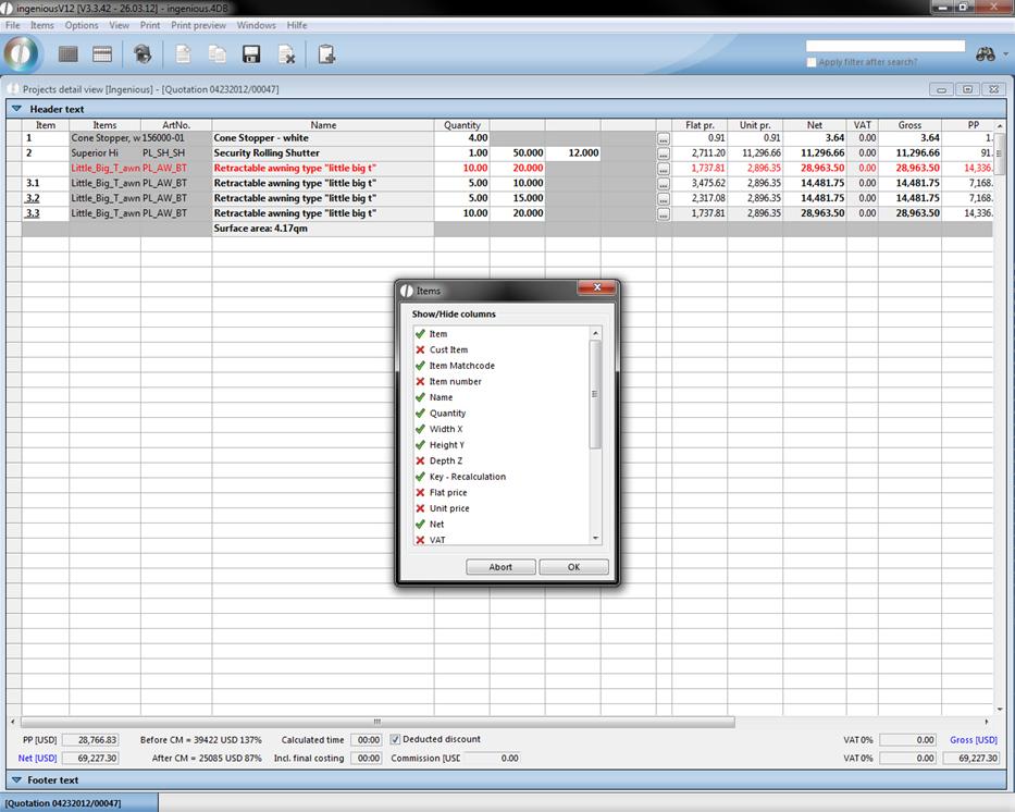 If you click on the function “Administer columns”, a window opens in which you hide and unhide the desired columns with a mouse click. If you hide the columns for the flat price and unit price, these are no longer illustrated in the item view.