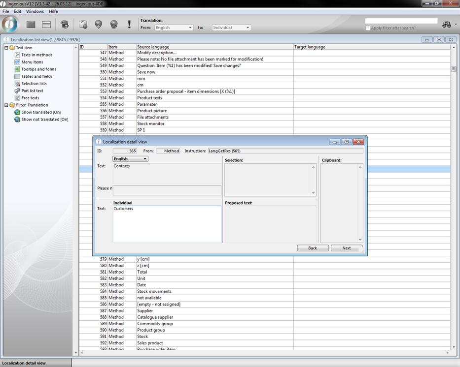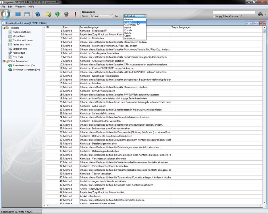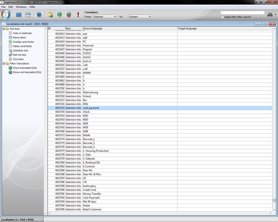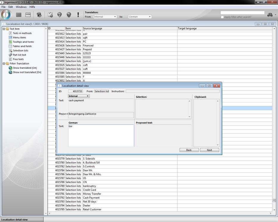 The localization manager is a comfortable tool for the translation of Ingenious.V12 into other languages. The translations can be done by a translator without the need for programming. With the localization manager, a special version of Ingenious.V12 for foreign branches or a partner edition for foreign clients can be created. In this manner, this management tool has an enormous impact for gaining new clients as well as for opening new markets.