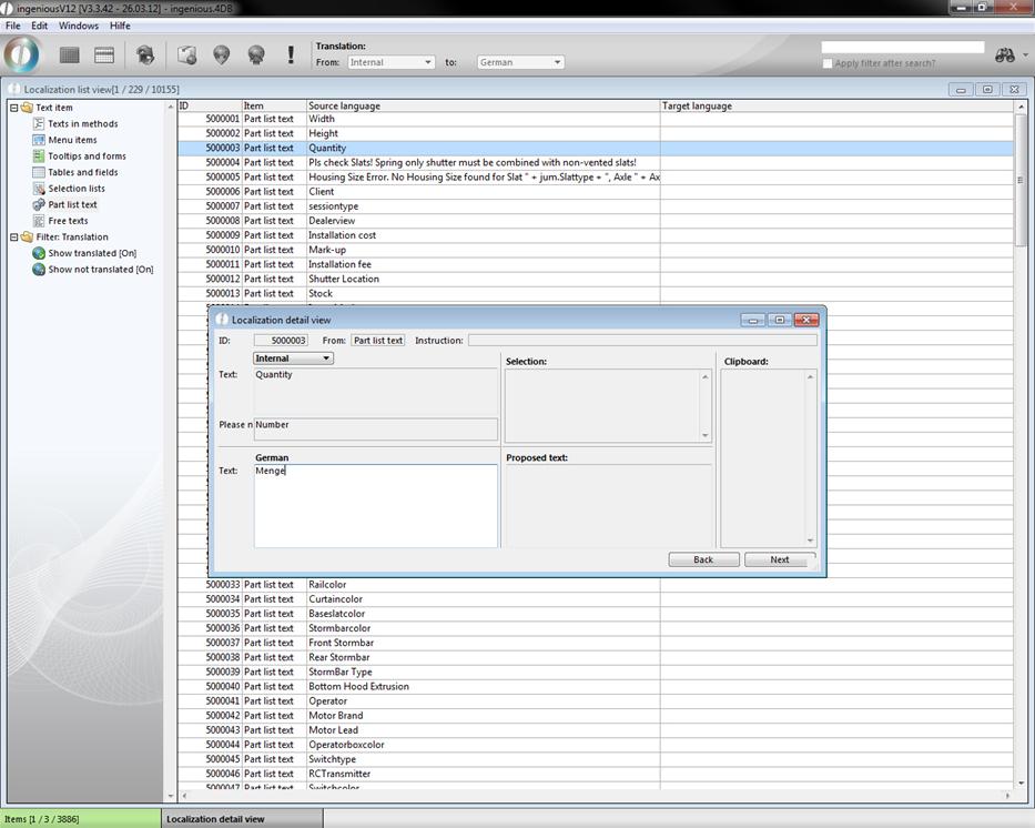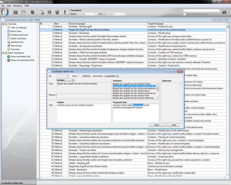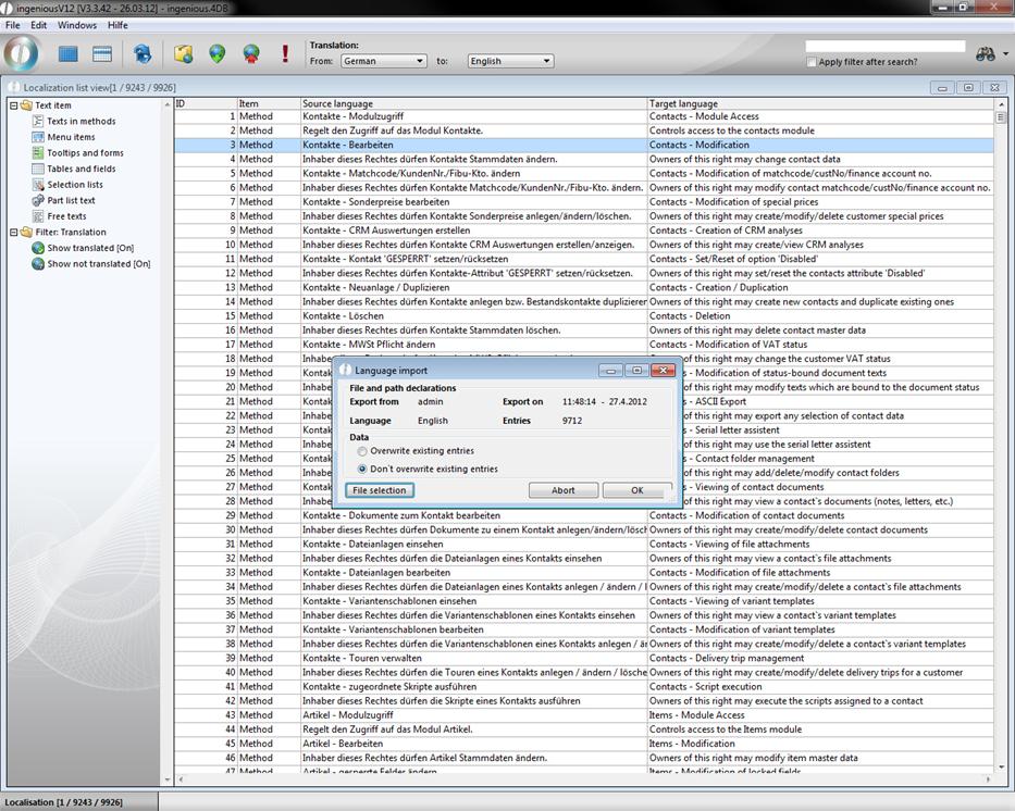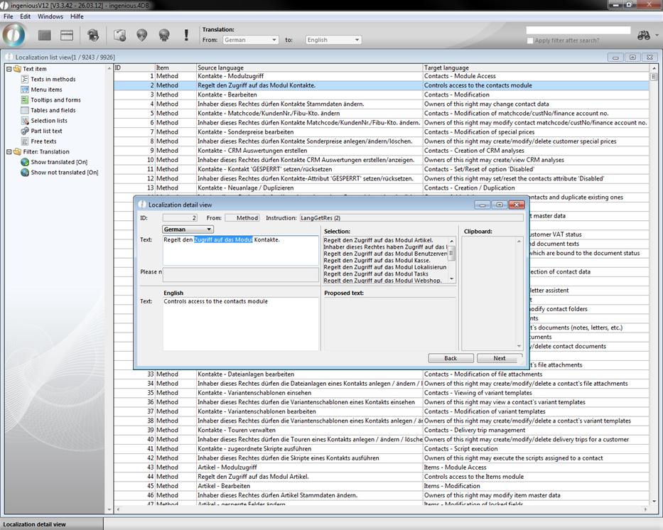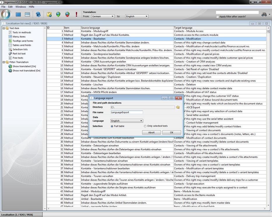 The localization manager is a comfortable tool for the translation of Ingenious.V12 into other languages. The translations can be done by a translator without the need for programming. With the localization manager, a special version of Ingenious.V12 for foreign branches or a partner edition for foreign clients can be created. In this manner, this management tool has an enormous impact for gaining new clients as well as for opening new markets.