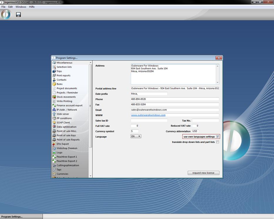 Leave the localization module and open the program settings and enter a checkmark in the area, “Use individual language adaptation”. Leave the program settings and save the changes.