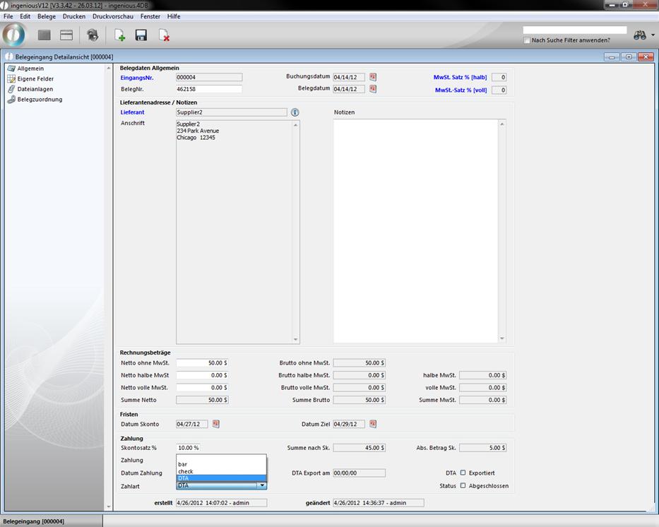 With the help of the localization module selection lists, part lists and free texts can be assigned with individual names resp. localize the user inputs into another language. In the field “Translation from” the value “internal” has to be chosen. In the following practice the selection list “payment type” of the receipt entry will be translated.