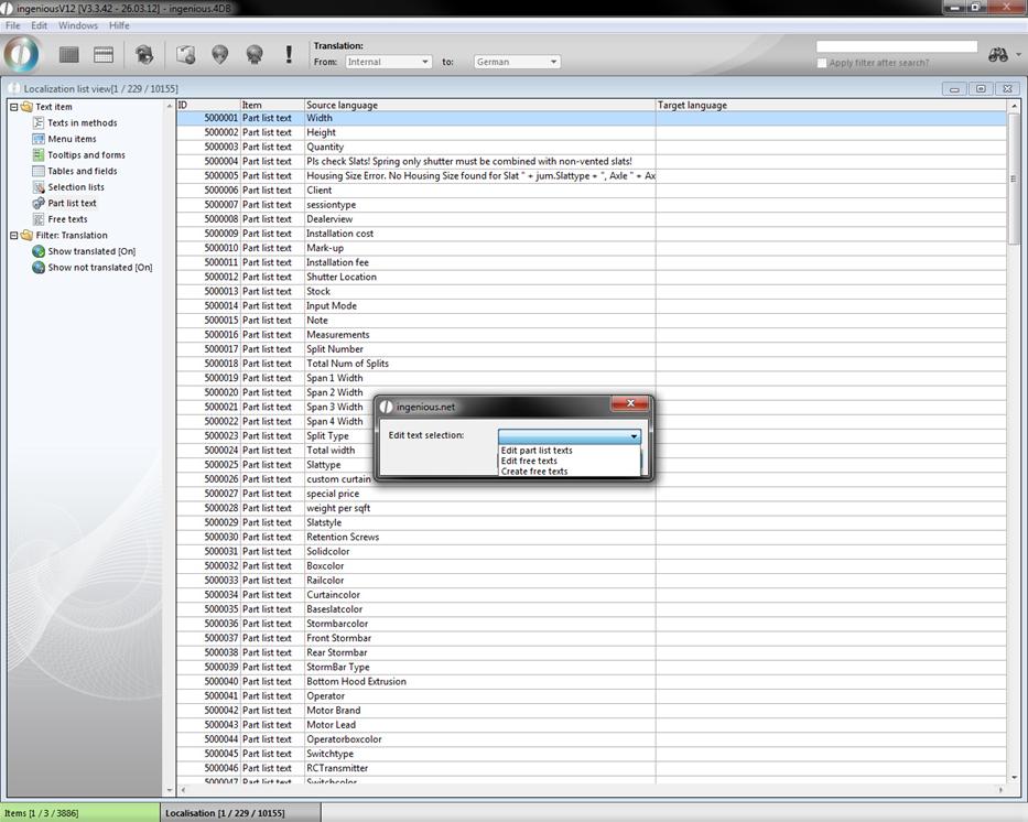 The values of the selection lists are taken from the program settings and the part lists from the items. You can transfer the part list texts to the localization module. For instance open any part list and click on the button “create part list translation”