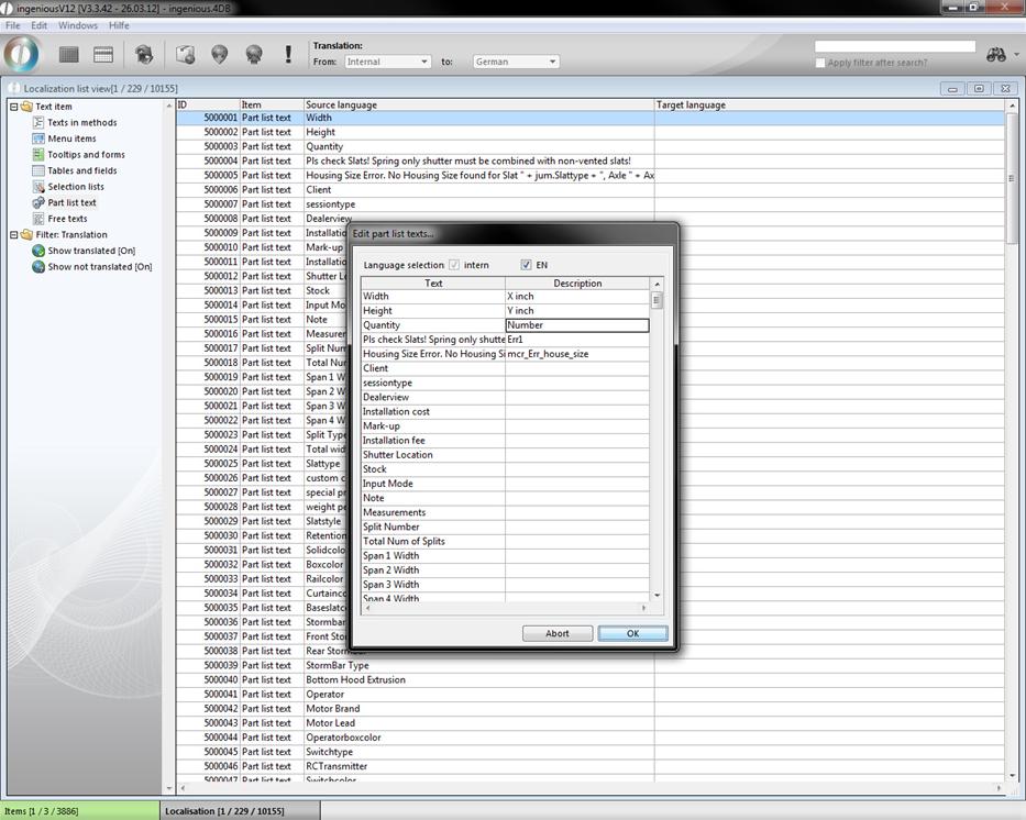 . A window will open up where all texts of the corresponding part list are listed. In the column description you can add a advanced description, which should simplify the translation. If you uncheck the field in the last column of a line, then the text will not be transferred to the localization.