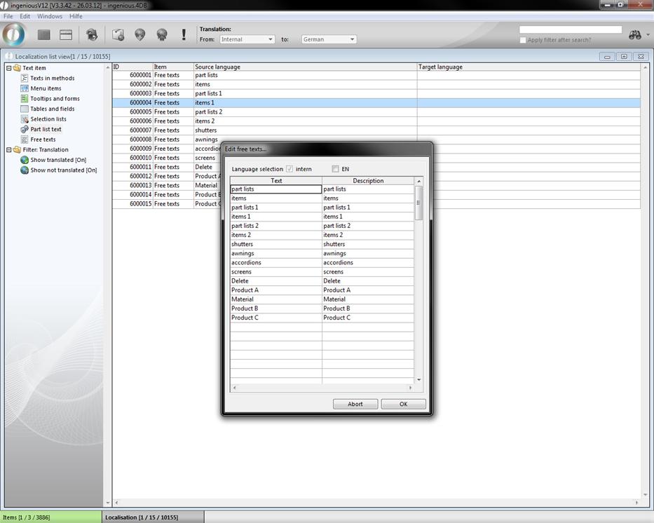 3. If you have done the desired translations, save the changes and close ingenious.v12. Now restart ingenious, choose the language DE and login again.