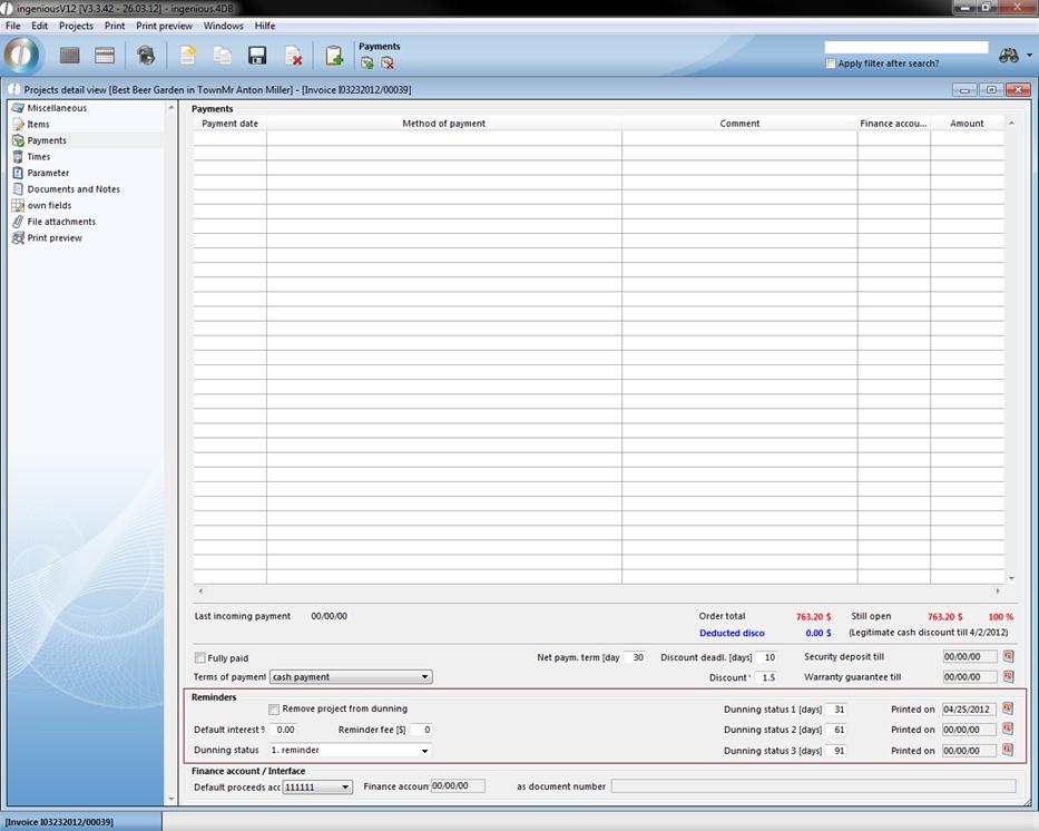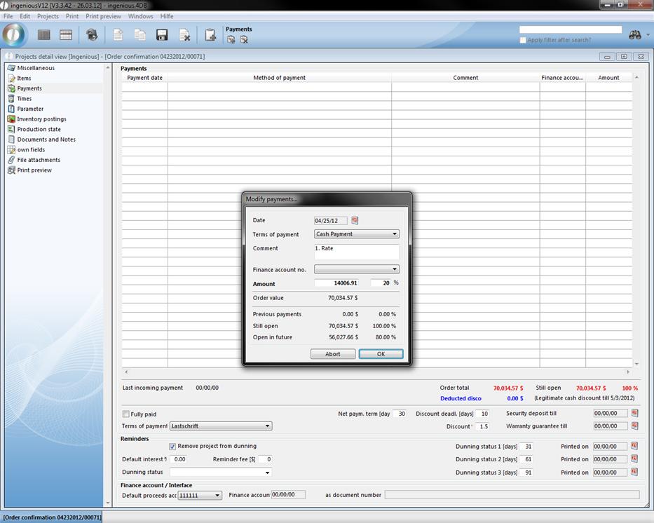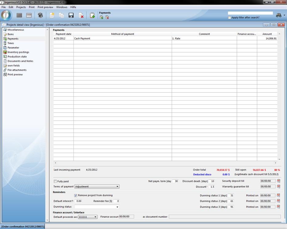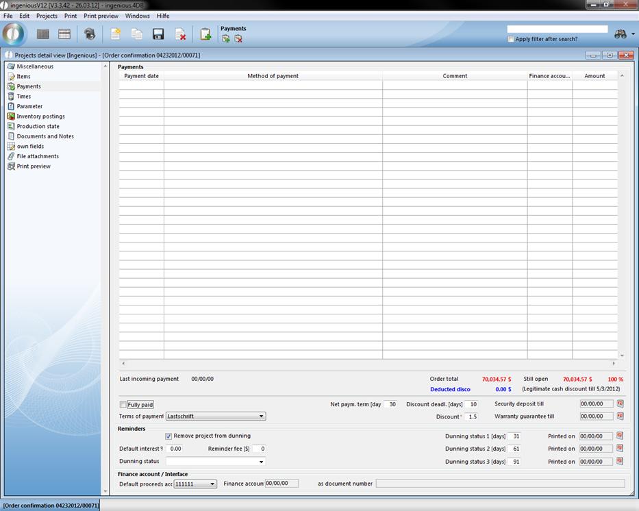 The “Payments” detail view is only available in the project documents, order confirmation, invoices and credits. In this column, you can see if and in which amount the customer made payments, or which balance of debt still exists.