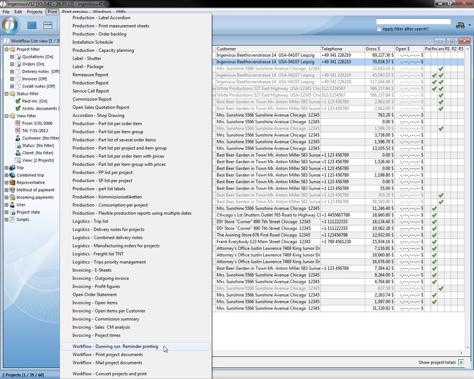 You can set up all past due invoices in the list view with a few steps in one print run. Select the menu option, “Print/Workflow – Print dunning run & reminders”.
