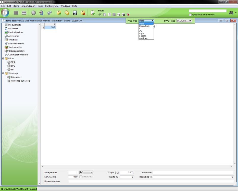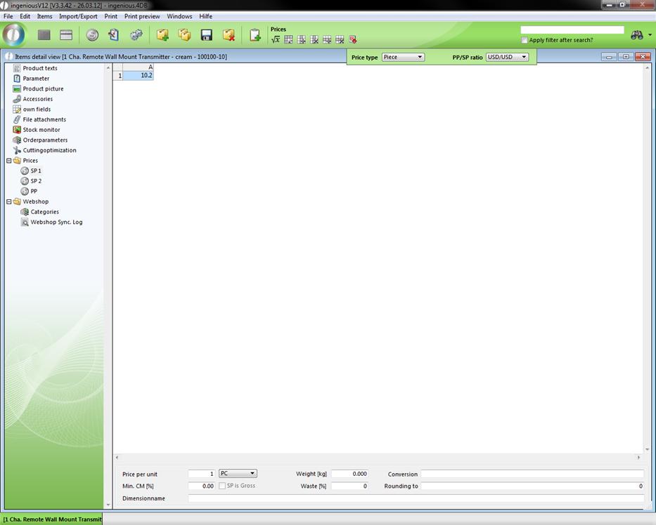 Undisputedly, the price belongs to the most important data that you can save to an item. In Ingenious.V12, the three price columns are organized under “Prices” according to “SP 1”, “SP 2” and “PP” for clarification reasons.