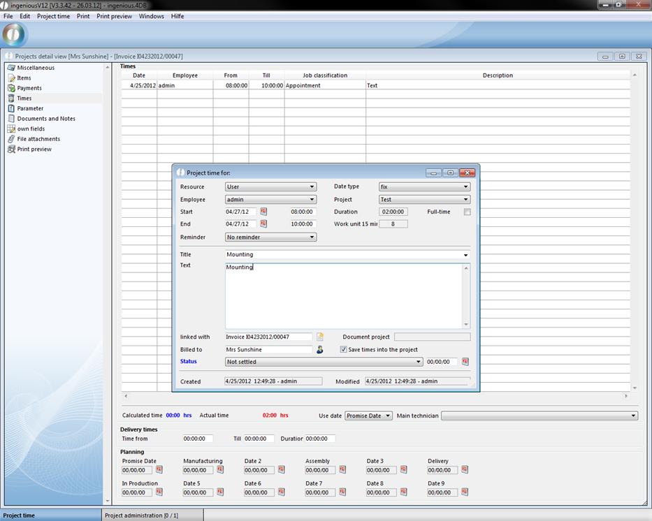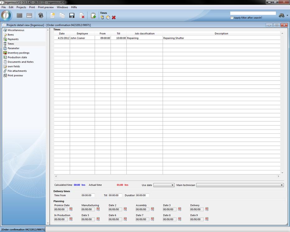 In the workflow areas (Sales, production, logistics and invoicing) one can create and enter project time entries in different projects (Quotation, confirmation order, invoice, etc.) which are automatically taken into consideration with the time management. Thus it is possible to administer project relevant appointments, such as measurement appointments or assembly appointments, directly through the project. This makes the appointment planning more clear and more flexible.