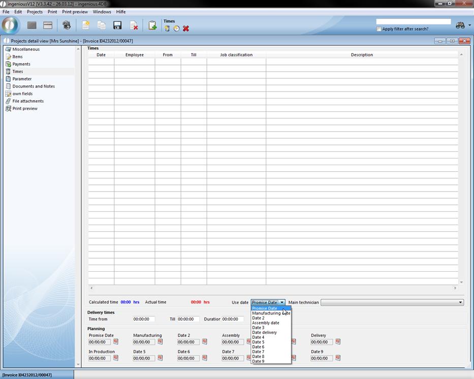 2. In the project detail view, choose the area “Times”. In the field “Use date” select the option “Promise Date” and enter the desired date in promise date in the planning area by clicking on the calendar icon