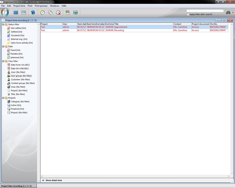 5. Save the appointment and leave the project detail view. Now open the administrative tools “Time Management”. Here you see the time entries created by you. You have the possibility to edit and manage all appointments created in the projects with the Time Management.