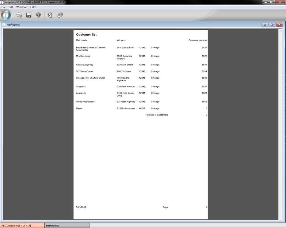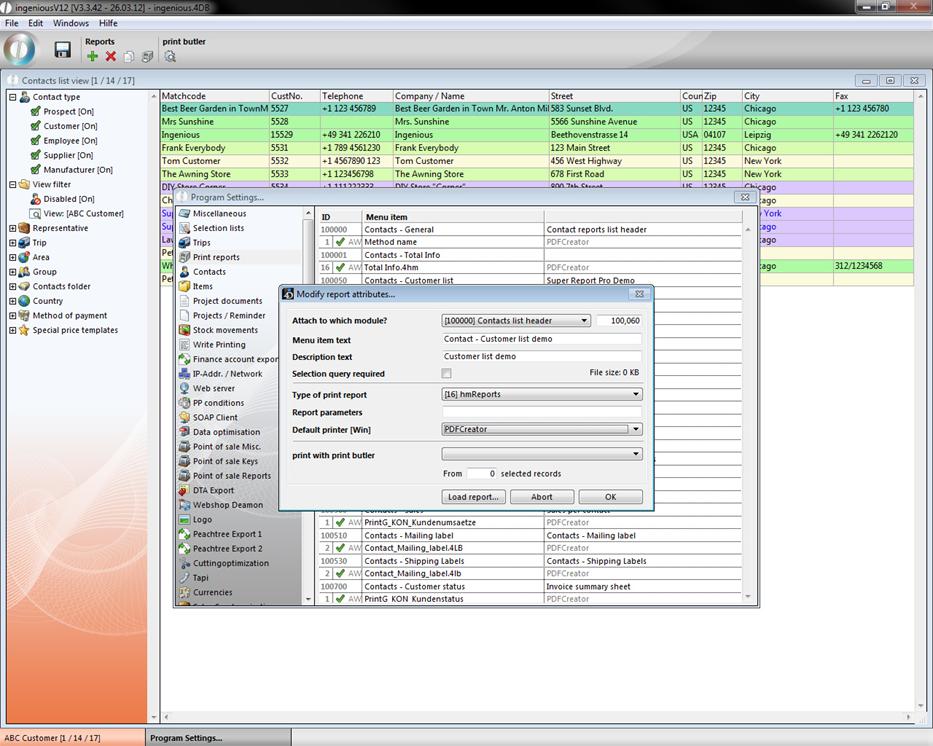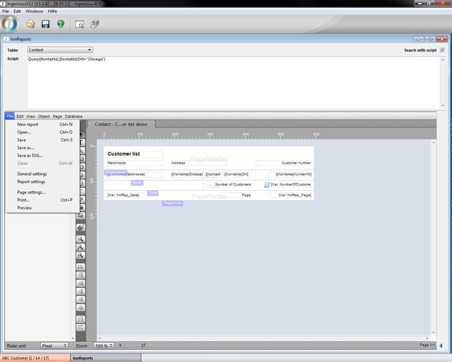 hmReport is a new plugin to create reports, which you can buy at Ingenious GmbH. In the program settings it can be assigned to any module with the print report “[16] hmReport”. In the following example a hmReport named “Contact – Customer list” for the module “Contacts” is created. If you want to load a existing report, you can do this by clicking “Load report…”
