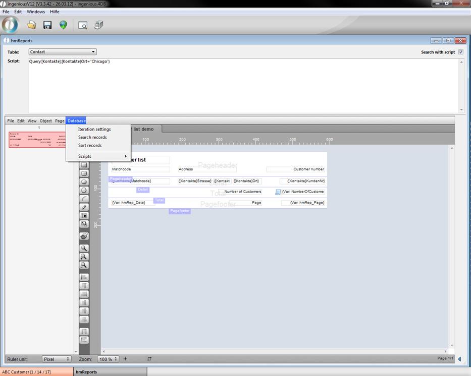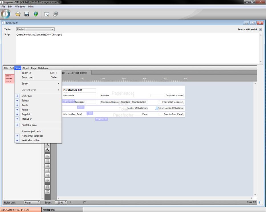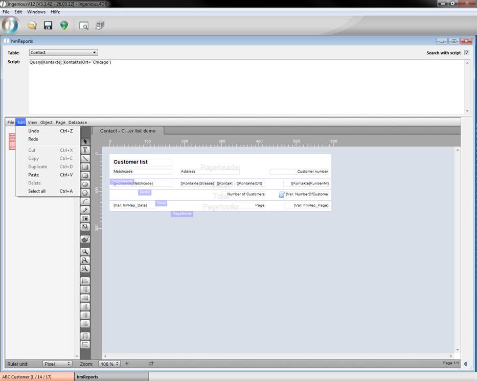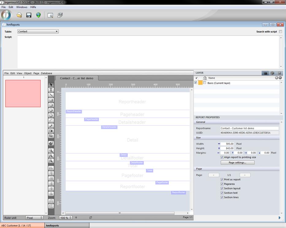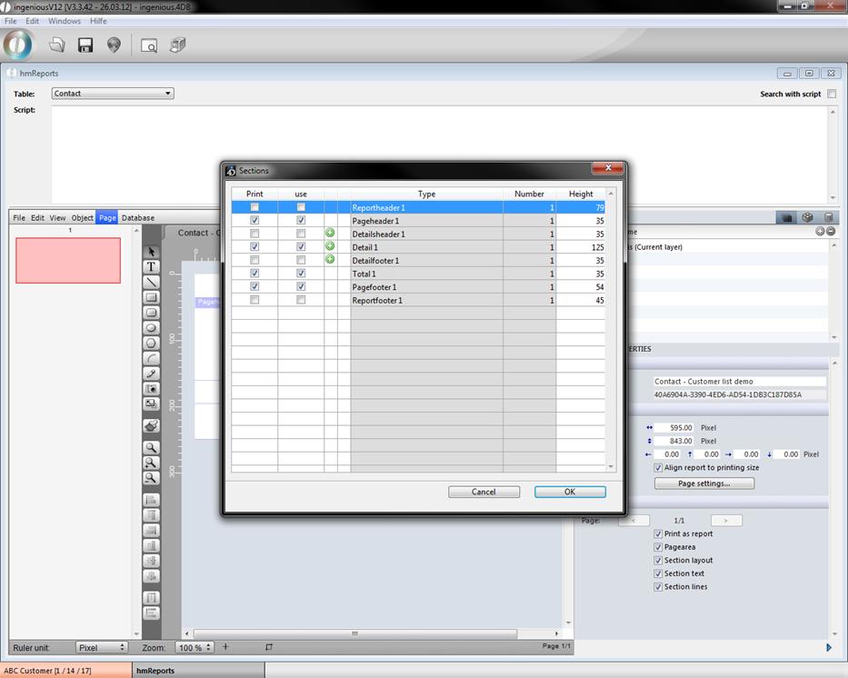 The hmReport window will open up. In the upper area you can choose the desired table, the report should refer to and add a script if necessary. In the lower area you can build an individual report with the help of the several menus, buttons and property bar (in the right area; to hide it click on