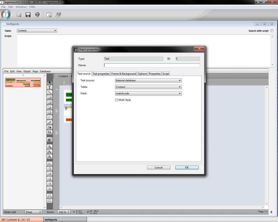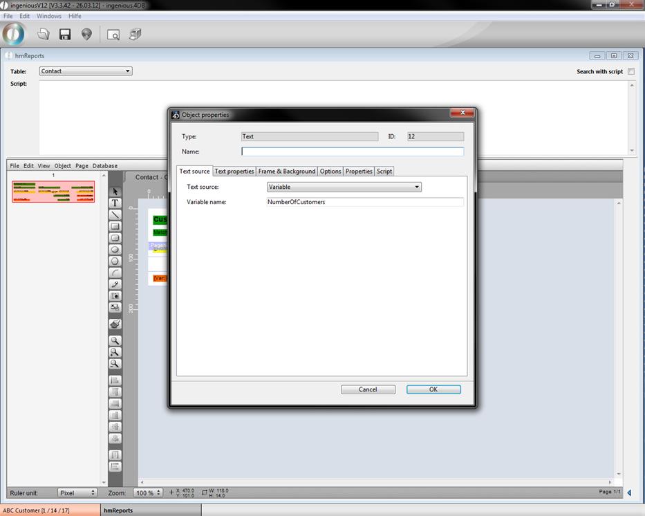 If you choose “variable” as text source you have to enter a name in the field “Variable name” and can change the value of it per script. There are also some reserved names for variables containing several predefined functions. This names are “hmRep_Date” (to display the current date); “hmRep_Time” (to display the current time); “hmRep_Record” (contains the current iteration number) and “hmRep_Page” (to display the current page number).